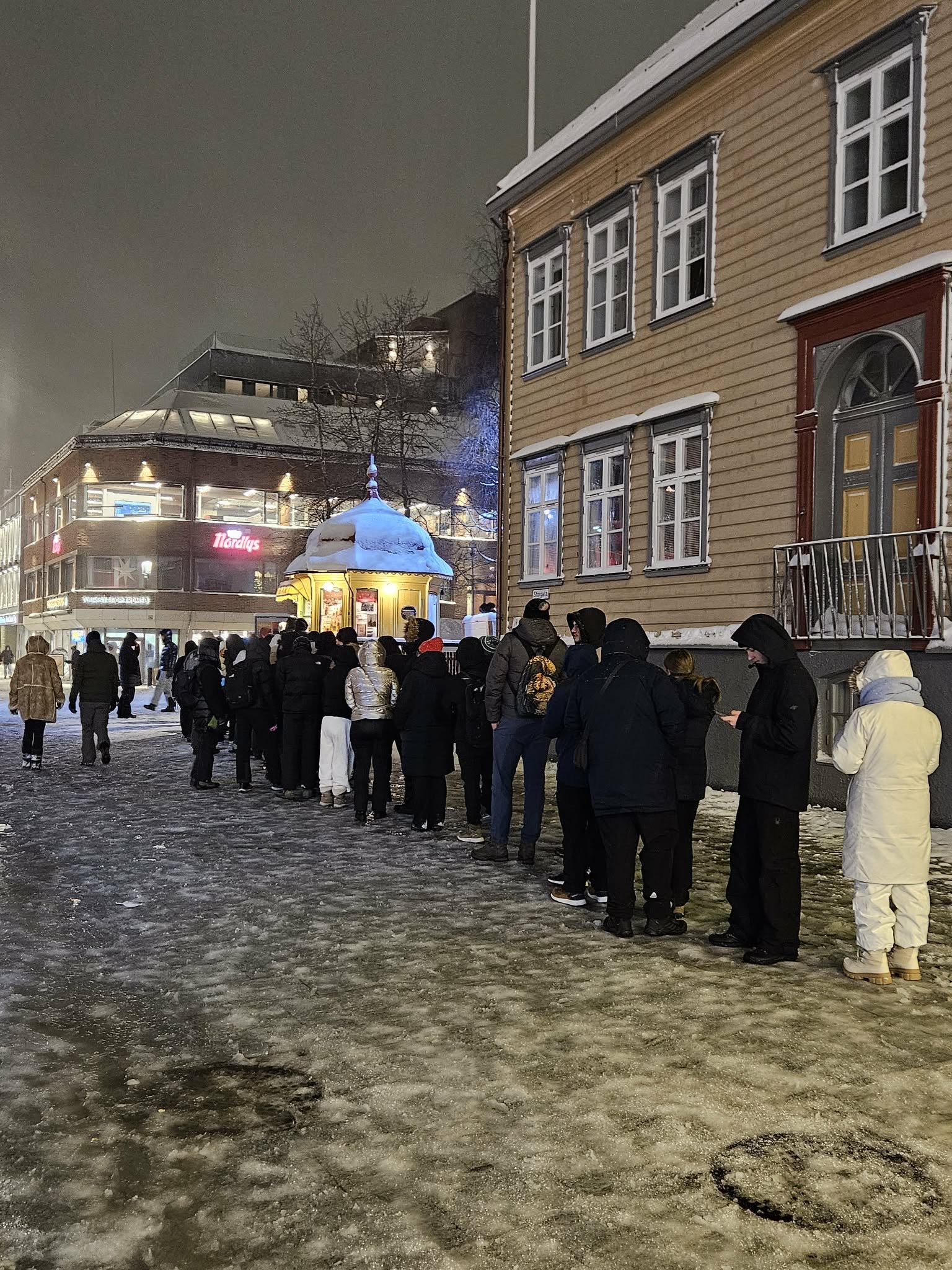 Det kryr av turister nå om vinteren. De kommer i flokker, stopper midt i gata, løfter telefonene, peker, ler, fryser, beundrer. De går over veien som om trafikkregler er et forslag. De tar opp halve fortauet og hele kaféen. De står i kø utenfor Rakettkiosken i en liten evighet for å kjøpe reinsdyrpølse fordi det står øverst på lista over what to do in Tromsø.